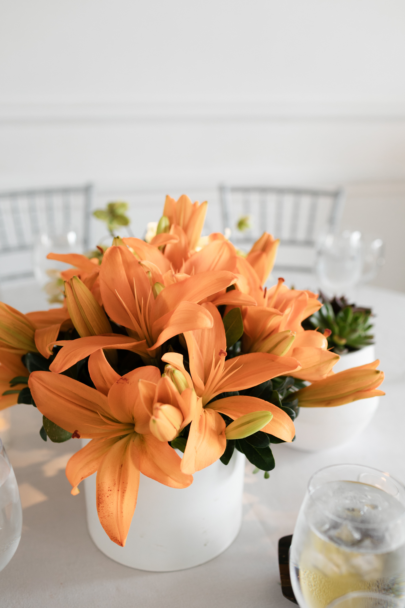 The florals followed the same bright and cheerful palette, featuring stunning arrangements of orange and yellow flowers that added warmth and energy to the space. The citrus-inspired design complemented the natural light of the brunch wedding and created an atmosphere that felt both elegant and playful.
